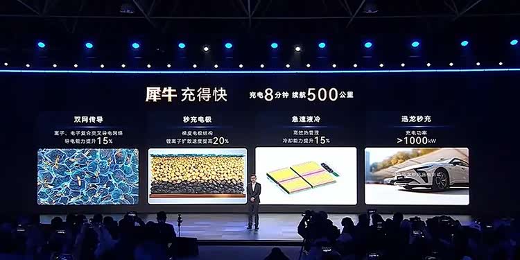 犀牛电池的特性可以理解为:最大充电功率 1200kW,实现 8 分钟充电续航 500km;