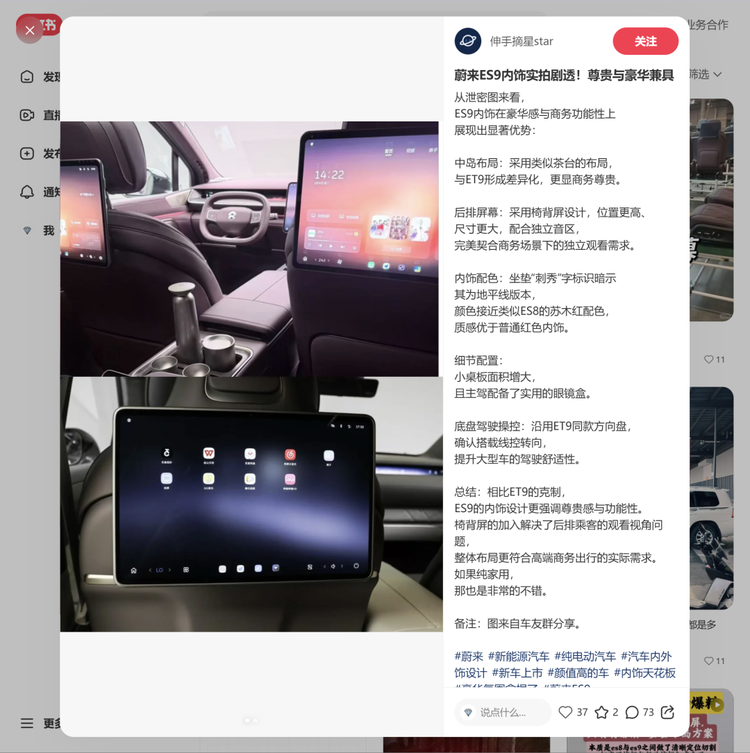根据各大社交平台博主的爆料,ES9 基本实锤沿用 ET9 的后排娱乐配置,也就是没有吸顶屏,而是前排座椅靠背双独立娱乐屏。至于尺寸,参考 ET9 的是 14.5 英寸,ES9 会不会有惊喜?