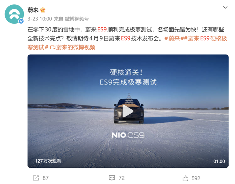 当然,ES9 也已经完成了香槟塔挑战,这次甚至还是在极寒雪地中完成的: