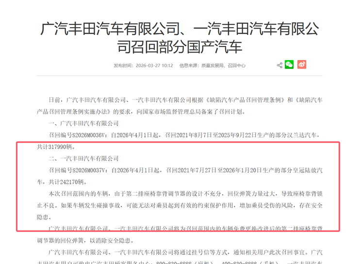 3月27日,一则来自国家市场监督管理总局的召回公告,将丰田汽车再次推至聚光灯下。公告显示,一汽丰田汽车有限公司根据《缺陷汽车产品召回管理条例》的要求,备案了大规模的召回计划:自2026年4月1日起,召回2021年7月27日至2026年1月20日期间生产的部分 皇冠陆放(参数|询价)汽车,共计242170辆 。
