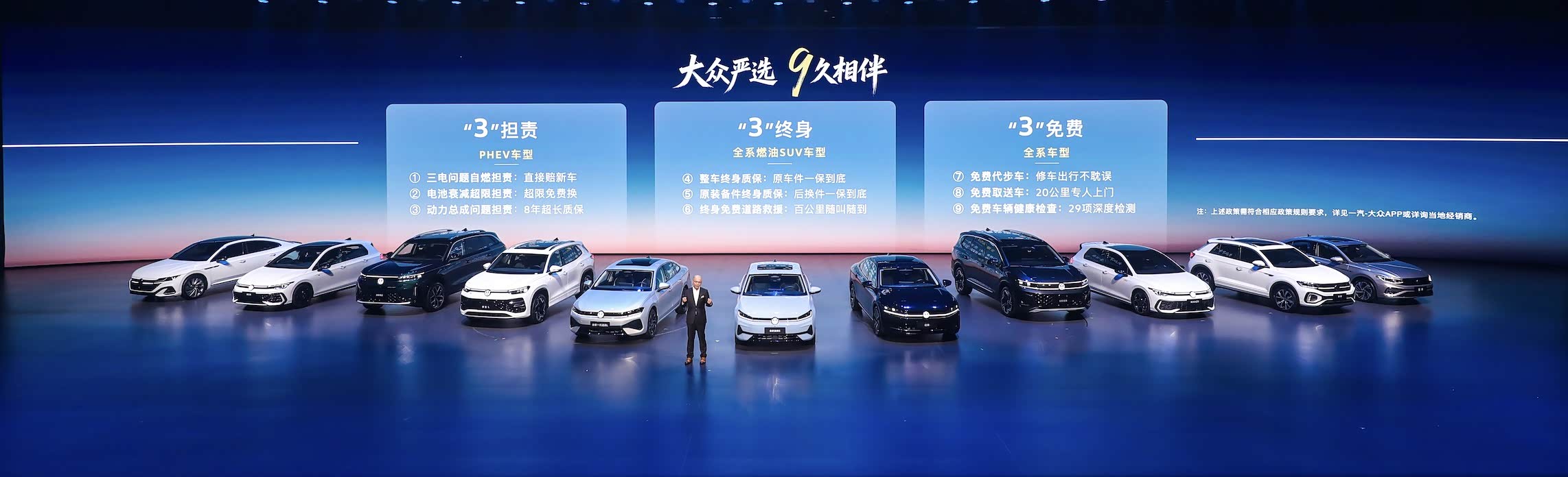 除了好车,一汽-大众还带来实打实的用户福利,推出“三担责、三终身、三免费”九大专属承诺,覆盖用车全生命周期: