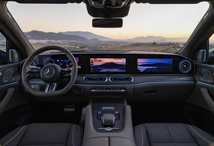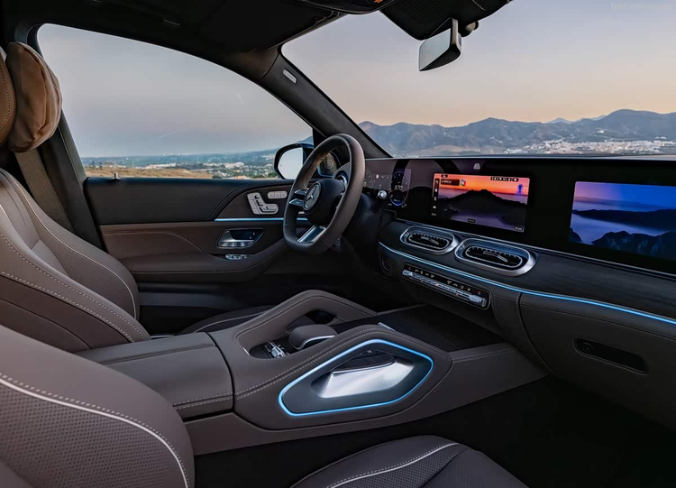 进入车内,新款GLS最引人注目的变化是中控台。它搭载了被称为MBUX Superscreen的超大联屏系统,这套系统由一块12.3英寸的全液晶仪表、一块14英寸的中控触摸屏以及一块同样为14英寸的副驾驶娱乐屏共同构成,三块屏幕被整合在一块完整的玻璃面板之下,营造出强烈的科技氛围。值得称道的是,奔驰并没有为了追求极简而完全取消实体按键,空调控制等常用功能仍保留了物理按键与旋钮,这种设计在兼顾触控操作便捷性的同时,也考虑到了行车过程中盲操的安全性与便利性。除此之外,新车还提供了全新样式的方向盘、圆形空调出风口、带有3D纹理的饰板以及多种内饰配色方案。在高配置车型上,诸如带振动功能的座椅按摩、后排独立娱乐系统等配置,将进一步强化其豪华与舒适的乘坐体验。在智能层面,新车机系统支持AI虚拟助手、整车OTA远程升级、丰富的车联网功能以及多屏之间的互联互动。其所搭载的驾驶辅助系统也得到了相应更新,使得高速导航辅助、主动刹车等功能的适用场景与可靠性更为完善。