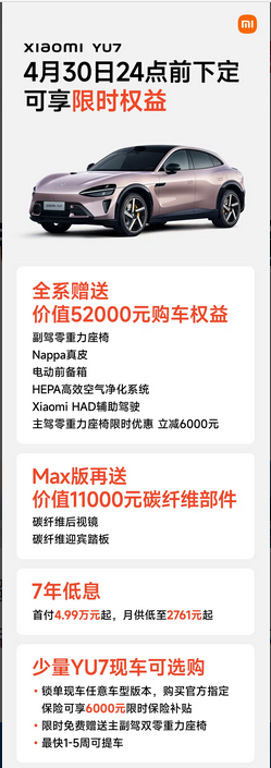 进入4月,小米汽车同步推出新的购车政策。针对YU7车型,提供最高63000元的限时购车权益,同时支持7年低息金融方案,首付4.99万元起,月供2761元起。这类金融方案对于预算有限但希望分期购车的用户具有一定吸引力。配置方面,现车用户可获得主副驾双零重力座椅的限时赠送,这一配置在实际体验中主要提升长途乘坐舒适性。同时,在锁单后选择官方指定保险,可获得6000元补贴,降低初期用车成本。