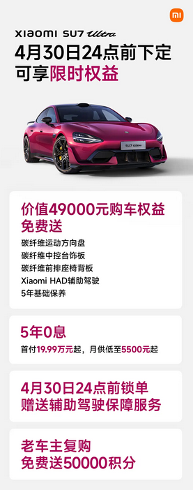 针对SU7 Ultra版本,官方提供价值49000元的购车权益,同时推出5年0息金融方案,首付19.99万元起,月供约5500元。从资金使用角度来看,这类方案可以降低一次性支付压力。此外,辅助驾驶保障服务作为附加权益提供,更多是针对系统使用过程中的风险管理。对于老车主复购,还提供50000积分,这类积分通常可用于后续服务或配件兑换,在用户体系内形成一定闭环。