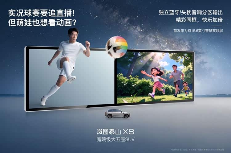 从发布“622庭院级空间标准”,给出同级最大车内6.1㎡座舱空间、二排双享零重力座椅、2米大床,到上车120度动力电池(EV)、华为896线四激光雷达,再到首搭华为双15.6英寸大双联屏,岚图泰山X8正以一套覆盖智能、空间、舒适、动力、安全的全维度解决方案,焕新家庭出行体验,重塑高端家用大五座SUV价值新标杆。