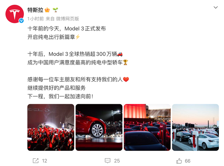 车家号·0浏览·2026-04-01 11:50 · 北京PChome 4月1日消息,特斯拉通过官微宣布:十年前的今天,Model 3正式发布,开启纯电出行新篇章;十年后,Model 3全球热销超300万辆,并成为中国用户满意度最高的纯电中型轿车。
