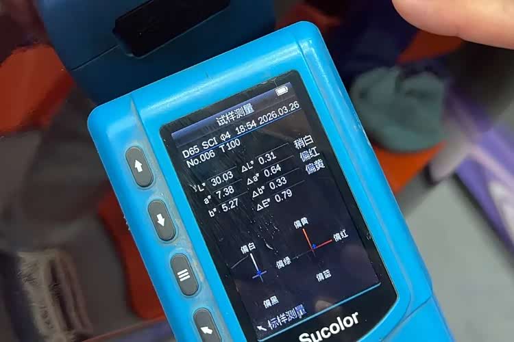 测试方法:使用色差计在引擎盖中央位置取基准数值。在车身其它位置进行对比测量,记录数值最大的位置。车身测试采样点不小于100个。