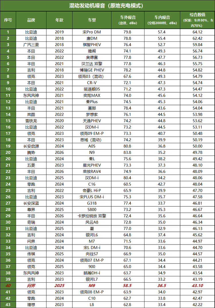测试方法:发动机完全热机,水温正常,关闭空调,正常怠速下进行测试;打开发动机盖、取下引擎罩,在距离发动机机体上方20厘米处,进行噪音采集,取平均值,为车外发动机噪音数值(dBa);在车内,将车窗关闭,发动机空载运转2000转/分,将噪音仪置于方向盘正上方,取平均值,为车内发动机噪音(dBa)数值。并且以车内30%,车外70%的权重进行综合计算。