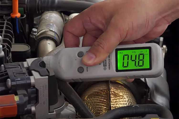 测试方法:水温正常后,关掉空调,在怠速状态下,使用测振仪垂直曲轴方向,将探针接触发动机金属机体中间的最高位置,测量发动机振动加速度值,数值越低,表明振动越小。