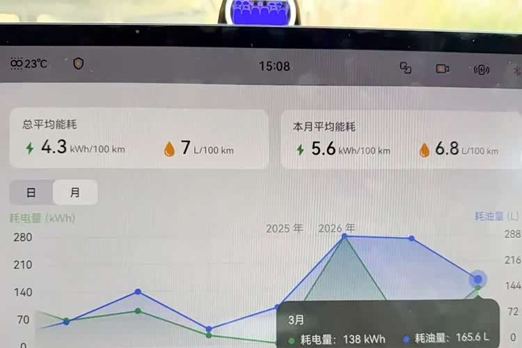 根据表显近百公里的平均电耗19.9千瓦时,由国标计算公式可以得出,按照燃料生命周期计算,当量汽油百公里消耗为4.77升;如果按照二氧化碳排放量计算,当量汽油百公里消耗为6.17升。