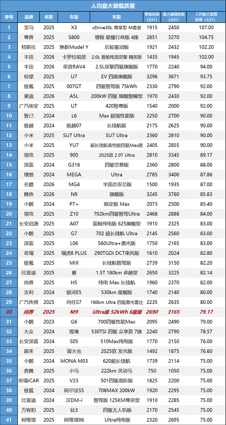 我们这辆车的整备质量为2690千克,最大满载质量为3165千克,计算得出这辆2025款 增程 Ultra版 52kWh 6座版 (192线激光雷达)的人均最大装载质量为79.17千克,比标准多出4.17公斤。