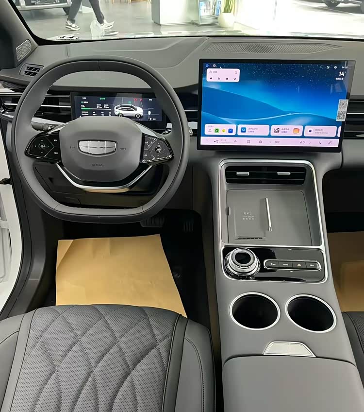 内饰方面,博越REV的低配车型提供黑色/星月灰的配色,中配和高配车型提供黑色/霞光棕、黑色/曙光橙的配色,采用电子怀挡,标配皮质多功能方向盘、8.8英寸液晶仪表、14.6英寸悬浮式中控屏,搭载Flyme Auto车机系统,支持车联网、OTA升级、手机APP远程控制、语音双区域唤醒识别等,支持HUAWEI HiCar、Carlink、Flyme link手机互联。