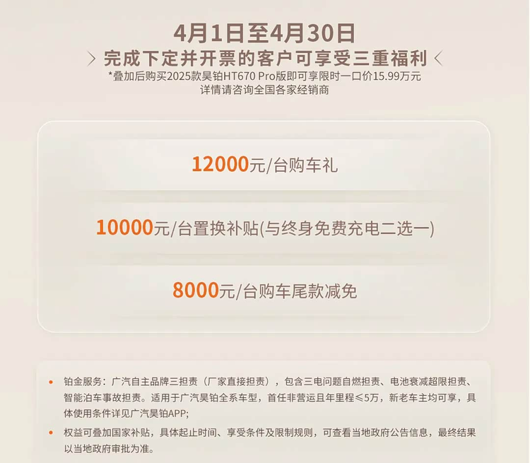 这价格怎么样?最近如果你关注中大型纯电SUV,可能已经注意到了广汽 昊铂HT(参数|询价)的一个新消息。从4月1日开始,持续到4月30日,下订并完成开票的客户,能够通过叠加三项具体的权益,以一种新的方式购车。其中,针对2025款昊铂HT 670 Pro版,在整合这些权益后,车辆的实际支付门槛会调整至15.99万元。这三项权益包括了1.2万元的购车礼、1万元的置换补贴,以及一项8000元的尾款减免措施。这并非简单的全系官降,而是一种集中在特定时间段和特定车型版本上的限时方案。