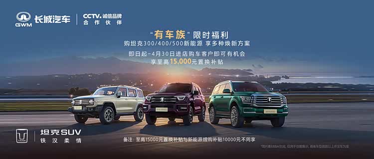 具体方面,4月1日起至4月30日,无论是本品牌还是外品牌增购用户,购买坦克300 Hi4-T、坦克400 Hi4-T/Z、坦克 500 Hi4-T/Z新能源车型,均可享受 10000元的增购补贴。