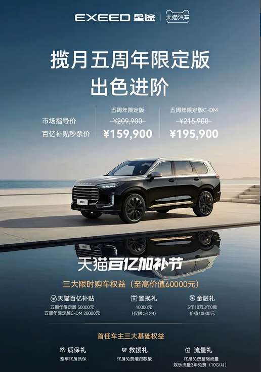 在当前中大型SUV市场竞争持续加剧的背景下,车型通过年度节点推出衍生版本,已经成为品牌维持关注度与产品节奏的重要方式。4月1日, 星途揽月(参数|询价)五周年限定版正式上市,新车共推出两款配置,官方指导价分别为20.99万、21.99万元,同时提供阶段性补贴后的限时价格区间为15.99万、19.59万元。从产品定位来看,该版本并未对整车架构进行调整,而是围绕外观细节和部分底盘配置进行优化,同时延续既有动力系统组合,整体策略更偏向阶段性强化产品吸引力。