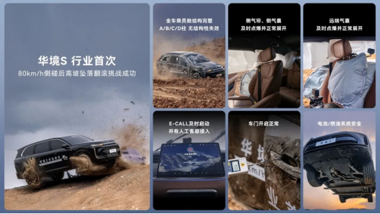 3月25日, 华境S(参数|询价)正式宣布完成行业前所未有的“80km/h侧碰后垂直高度15米高坡坠落翻滚”双重测试,测试中模拟的“高速行驶被侧面撞击后失控冲下路基”的致命连环事故场景侧碰速度甚至比国标高出60%,碰撞能量是常规测试的2.56倍,叠加15米(相当于5层楼)高坡翻滚的极端工况!
