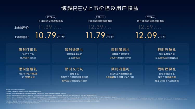 3 月 31 日,吉利博越 REV 正式上市。作为博越十周年推出的全新车型,新车共推出 3 款配置,CLTC 纯电续航覆盖 220km 与 375km 两档,上市惊喜价10.79 万 - 12.09 万元,相比此前 12.79 万元的预售起步价,起售价下调 2 万元。