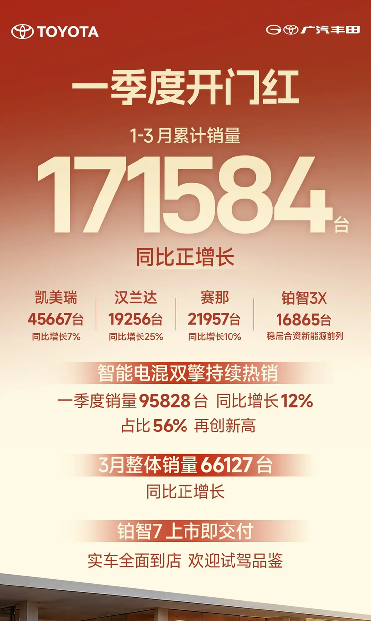 2026年一季度,广汽丰田在市场竞争中保持增长韧性,核心车型与智能电混双线发力,后续将持续优化产品矩阵与用户服务,冲击全年销量目标。