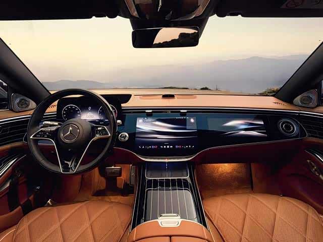 新款迈巴赫S级的座舱延续了环抱式布局,但中控区域设计有较大变化。新车取消了此前的纵向大屏,改用了一体式玻璃面板,将14.4英寸中央显示屏和12.3英寸副驾屏整合在一起,仪表盘也提供了3D显示选项。材质用料上,新车内部大面积覆盖了Nappa真皮,并新增了炭灰色开孔橡木、琥珀棕鱼骨纹木饰板以及榉木棕内饰配色。值得一提的是,这次迈巴赫首次提供了非动物皮革的内饰选项,采用名为“Mirville”的混纺织物,迎合了当前主流的可持续理念。