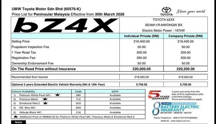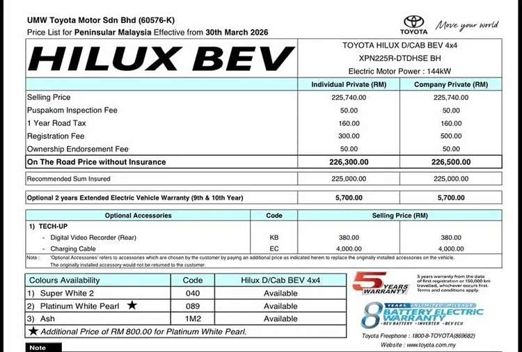 想说省油而买纯电皮卡,但当地纯电海拉克斯 Travo-e皮卡销售可能不便宜。马来西亚这次只引入纯电车款,油车则用旧款继续卖。当地旧款油车丰田 海拉克斯建议销售RM104,880.00起,纯电的新一代海拉克斯 Travo-e接单价为RM 226,300起,比当地同样接单中的小改款bZ4X贵一点点。中国现行款海拉克斯建议销售159.5万起,小改款bZ4X则为128万元起。