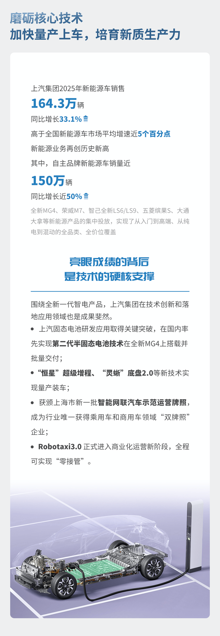 磨砺核心技术,加快量产上车,培育新质生产力。2025年,上汽集团新能源车销售164.3万辆,同比增长33.1%,高于全国新能源车市场平均增速近5个百分点,新能源业务再创历史新高。其中,自主品牌新能源车销量近150万辆,同比增长近50%。全新MG4、荣威M7、智己全新LS6/LS9、五菱缤果S、大通大拿等新能源产品的集中投放,实现了从入门到高端、从纯电到混动的全品类、全价位覆盖。