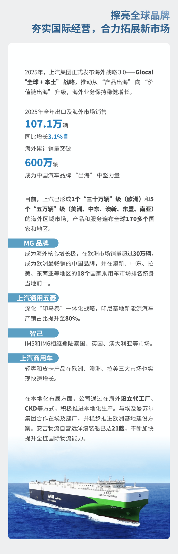 擦亮全球品牌,夯实国际经营,合力拓展新市场。2025年,上汽集团正式发布海外战略 3.0——Glocal“全球 + 本土” 战略,推动从 “产品出海” 向 “价值链出海” 升级,海外业务保持稳健增长,2025年全年出口及海外市场销售107.1 万辆,同比增长 3.1%,海外累计销量突破 600 万辆,成为中国汽车品牌“出海”中坚力量。
