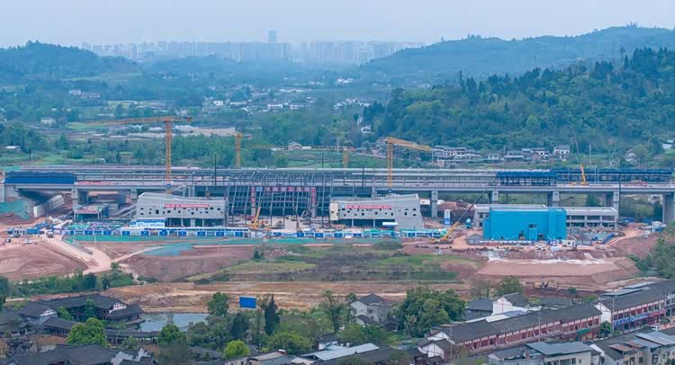 日前,大足石刻站站房混凝土主体结构已顺利封顶,钢结构屋盖网架顶升工作正有序开展。项目预计 2026 年内全面完工,并达到静态验收标准。全线计划 2027 年建成通车,届时大足到重庆仅需 15 分钟,至成都只需 30 多分钟。