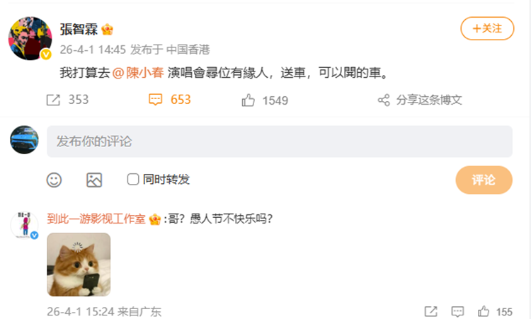 如果这条消息不是4月1日发的话,大家肯定会以为这是和哪家车企合作,给车企以及演唱会造势。但这是4月1日愚人节,大家是真分不清张智霖这条是认真的商业合作,还是个愚人节玩笑,以至于这条消息的评论区里成了一片欢乐的海洋,还有不少网友催促张智霖赶紧营业,演唱会、影视剧计划抓紧时间提上日程。