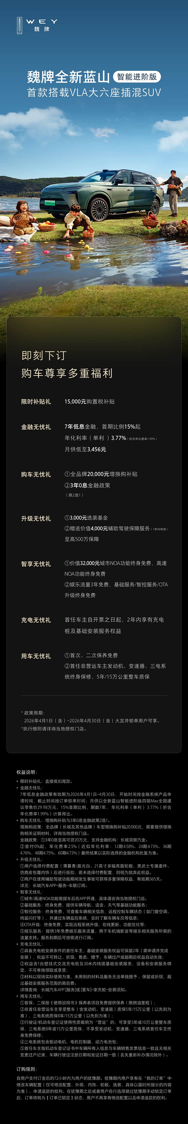 本月下订全新蓝山智能进阶版,即刻享受15,000元购置税补贴,直接降低购车成本。金融方面,提供7年低息方案,首期比例仅需15%,年化利率3.77%,月供低至3,456元,真正让全新蓝山智能进阶版轻松开回家。对于增换购用户,全品牌可享20,000元增换购补贴,置换旧车时直接抵扣;若更倾向于金融方案,也可选择3年0息政策,两种权益二选一,灵活适配个人购车习惯。此外,4月购车还将获得3,000元选装基金,以及价值4,000元的辅助驾驶保障服务,至高享500万保障,让选装更自由、出行更安心。(※上述政策适用于2026年4月1日至4月30日期间大定并锁单的用户,具体细则及适用要求可详见长城汽车APP、魏牌官网等官方平台,或咨询当地授权门店)