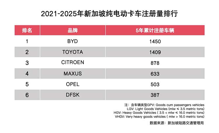 在电动卡车领域,2020年,比亚迪进入新加坡市场,并开始向当地正式交付环卫车T9,成为当地首家销售电动卡车的企业。2021年至2025年期间,比亚迪纯电动卡车于新加坡的五年累计注册量达到1450台,在当地排名首位。