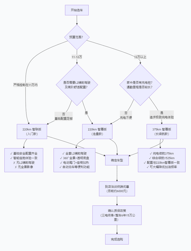 - 预算在12万元以内,且希望配置一步到位,220km智尊版是综合配置较均衡的选择。