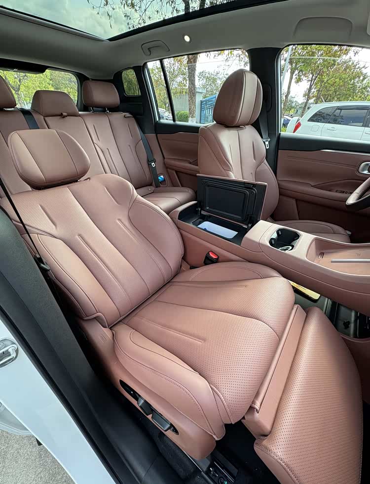 座椅部分也花了不少心思。副驾驶配备了带电动腿托的零重力座椅,加上扶手箱内的智能冷暖冰箱和大尺寸流光美妆镜,对副驾乘客的照顾很到位。前排座椅标配加热、通风、按摩和记忆功能,后排座椅靠背支持117°到137°的无极调节,而且右侧座椅坐垫还可以抬高,专门为小朋友设计。