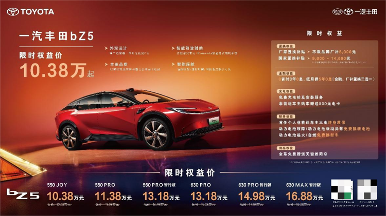 纯电车型bZ5在4月推出限时权益加码,置换权益升级为不限品牌厂补8000元,更可叠加9000-14600元的国家置换补贴,550JOY车型叠加厂补及国补后,限时权益价低至10.38万元。金融权益也是诚意满满,0首付3年0息,低月供5年0息,降低购车门槛(置换、金融二选一)。同时匹配免费充电桩、500元电卡、非营运车主三电终身质保及电池三兜底保障政策,为后续用车提供安心保障。4月购车用户还可免费获赠天窗遮阳帘,舒适加倍。