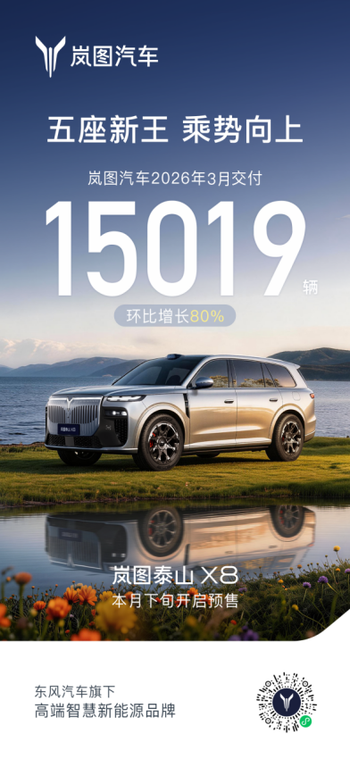 【2026年4月1日,武汉】4月1日,岚图汽车发布3月销量数据,3月交付15019辆,同比增长50%,环比增长80%,1-3月累计交付33892辆,同比增长30%,延续高质量增长。3月,岚图在资本、产品、技术层面三线齐发,开启发展新周期。资本层面,岚图成功登陆港交所,成为“央国企高端新能源汽车第一股”,控股股东一致行动人启动股份增持计划,强化市场信心;产品层面,3月19日,“五座新王”岚图泰山X8全球首发亮相,首发华为双15.6英寸智慧双联屏,搭载华为乾崑896线双光路图像级激光雷达+3固态激光雷达的方案,以“622庭院级标准”即6.1平米座舱空间、可容纳2米大床、后排双享零重力座椅,重新定义大五座SUV市场规则,4月下旬将开启预售;技术层面,岚图L3级智能架构率先量产落地,加速L3级有条件自动驾驶商业化进程。