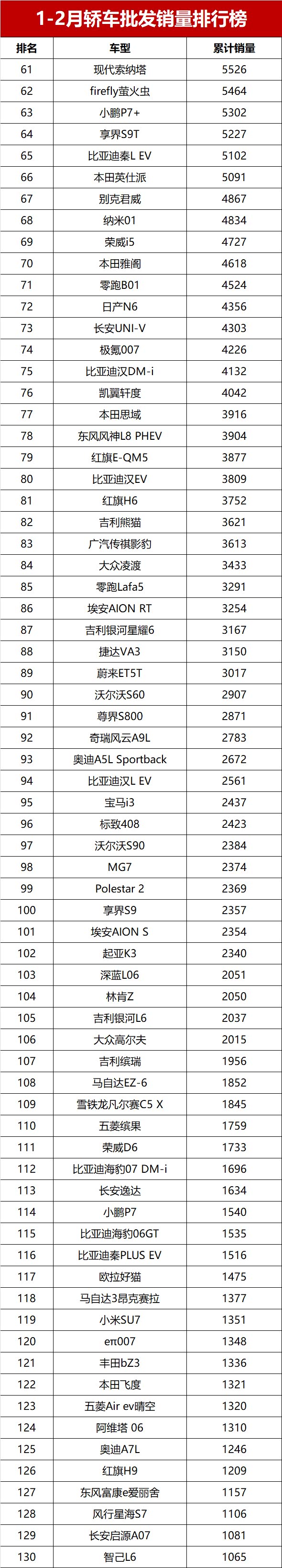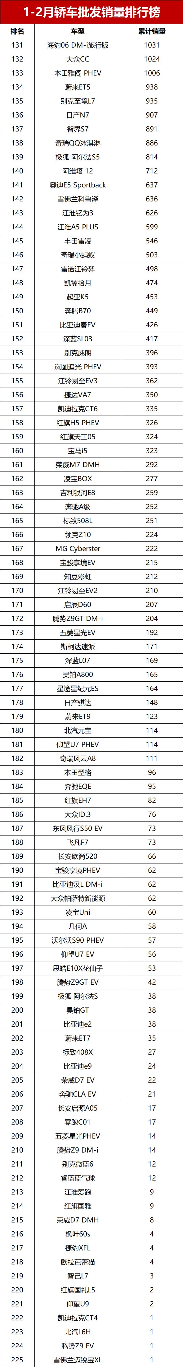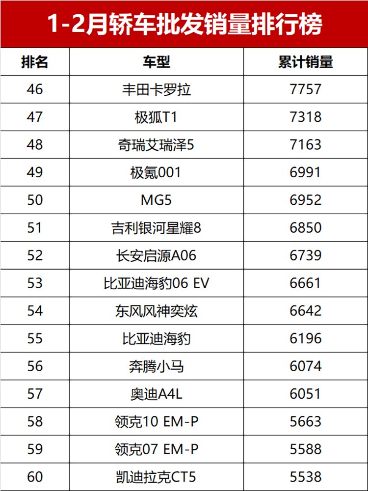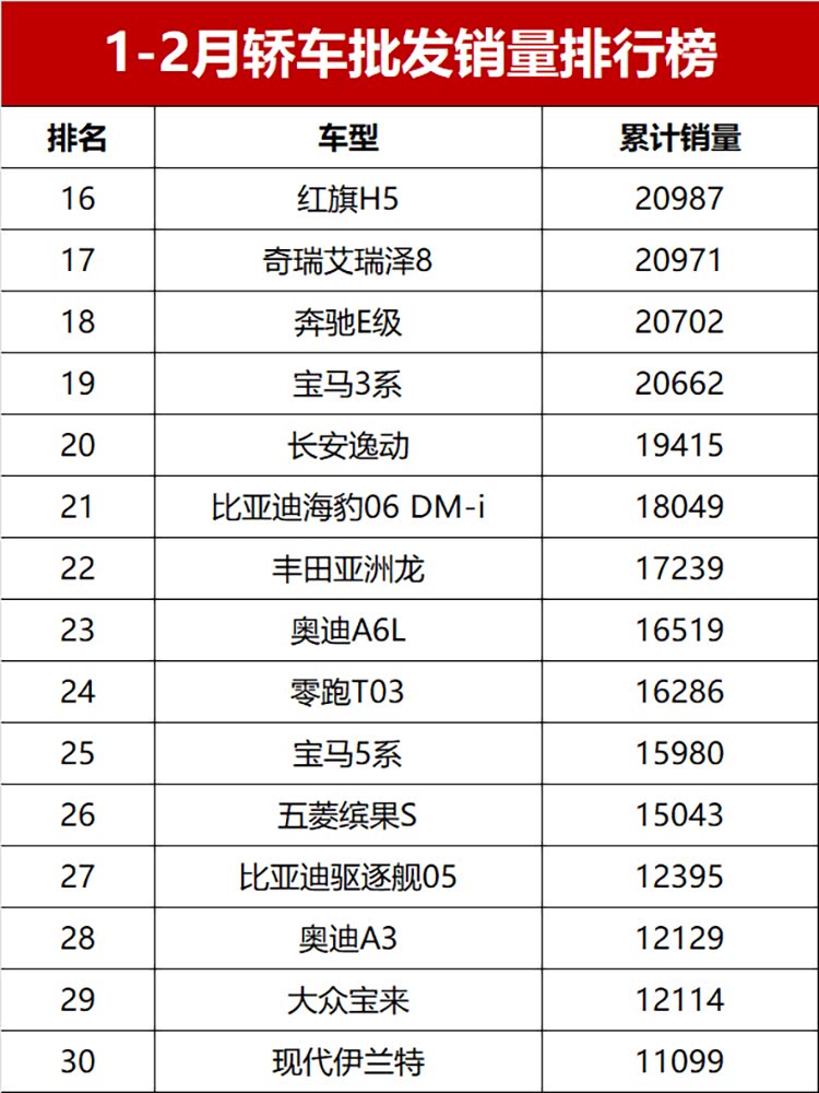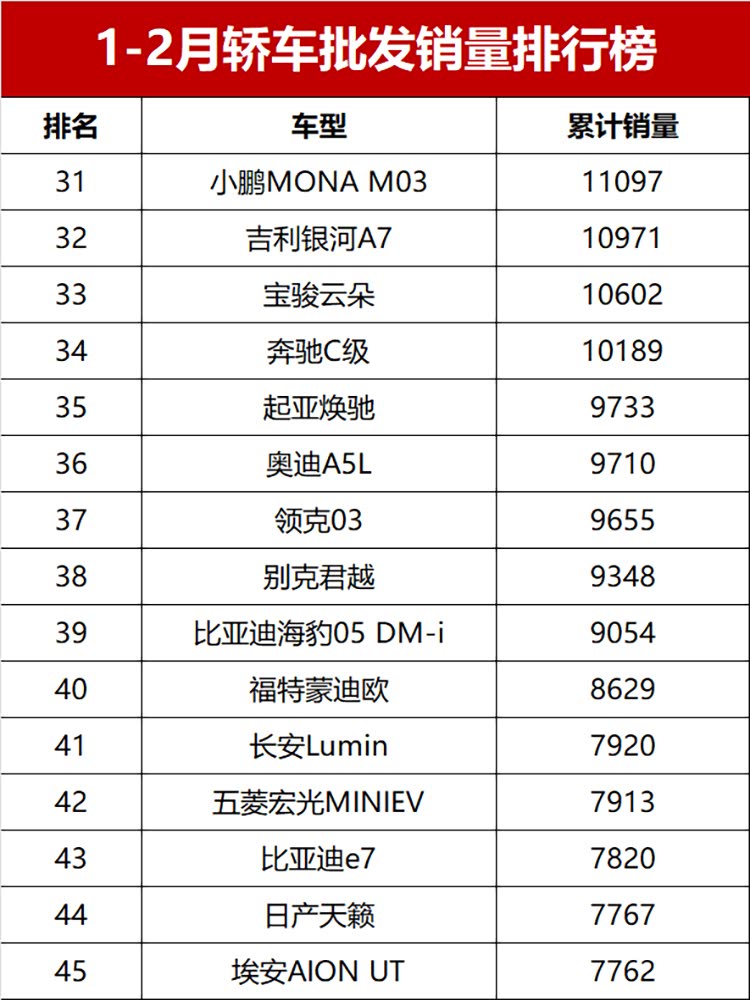 值得一提的是,新能源依旧强势,直接包揽了销量榜的冠亚军;传统燃油车也没拉胯,展现出不错的韧性;1-2月累计销量超2万辆(月均破万)的车型有19款,其中燃油车12款、新能源车7款,冷热不均的格局很明显!话不多说,完整版销量榜来了,看看你关注的车有没有上榜~