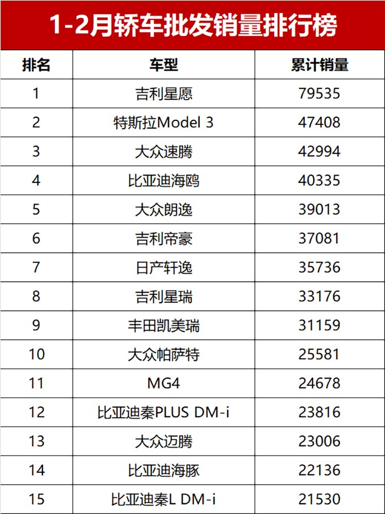 具体来看,1-2月累计销量超2万辆的19款车型,算是撑起了轿车市场的半壁江山。其中吉利星愿直接断层领跑,以79535辆的成绩拿下冠军,这个销量比第二名多出了3万多辆,实力直接拉满,不愧是近期的热门车型。紧随其后的是特斯拉Model 3,以47408辆的销量稳居亚军,作为榜单前两名里唯一的合资新能源车,这样的表现也算不负众望,尤其是2月份单月销量同比暴涨,势头很猛。
