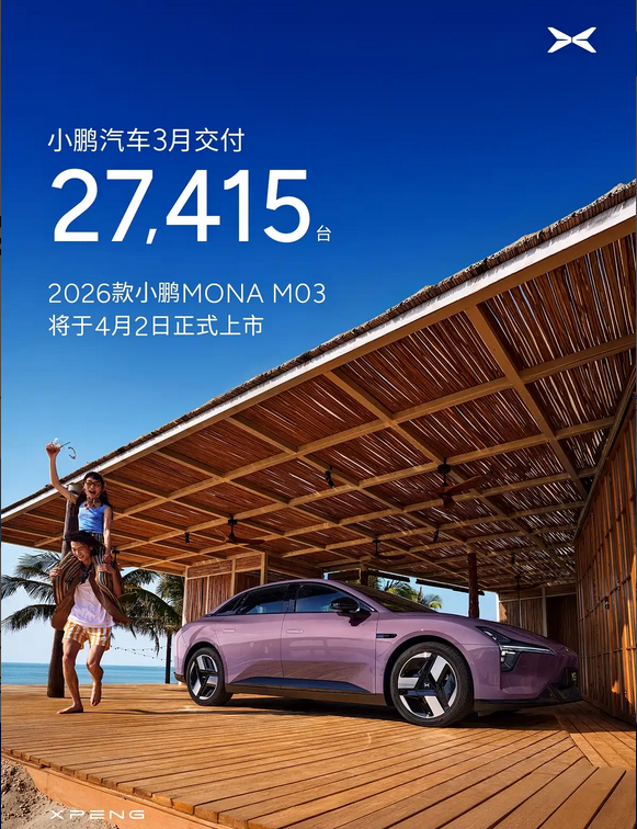 日前,小鹏汽车发布了最新销量数据,截至2026年3月小鹏汽车交付总量达到27415台,相较2月实现约80%的环比增长。其中, 小鹏X9(参数|询价)单月交付3075台,同比增长约134%,全球累计交付突破55000台。这一成绩反映出该品牌在中大型智能电动车市场的持续活跃度。同时,公司宣布2026款小鹏MONA M03将于4月2日正式上市,为市场提供新的车型选择。