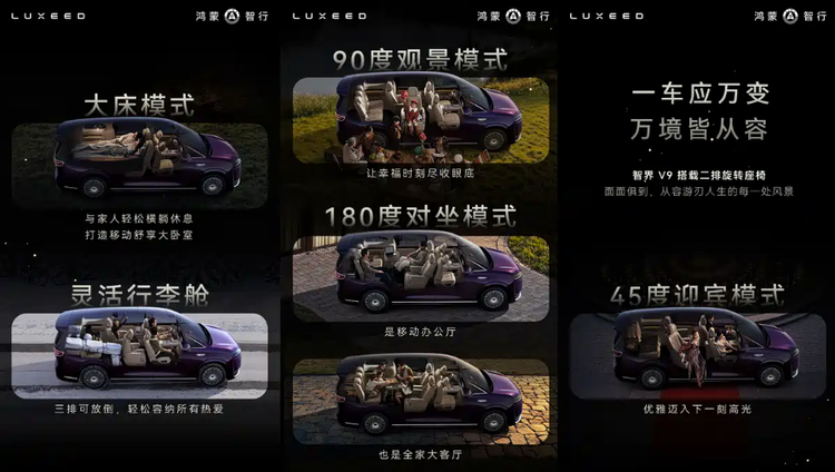 内饰方面,智界V9采用一体式横向贯穿屏幕设计,搭配中控台下方的水晶旋钮及NAPPA头层真皮包覆,营造出精致豪华的座舱氛围。音响系统则搭载HUAWEI SOUND,带来沉浸式听觉体验。二排座椅支持一键联动调节靠背、腿托与脚踏,可实现1.05米超长腿部支撑。通过座椅旋转与姿态变化,新车可提供大床模式、灵活行李舱、90度观景模式、180度对坐模式以及45度迎宾模式,覆盖商务洽谈、家庭出游、休憩小憩等多元场景需求。