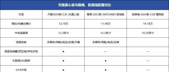 接着就到天籁真心版配置方面,从核心配置是在车载智能,搭载Nissan Connect超智联。如下表所示,天籁真心版与配置段位的雅阁(经销商参考价:11.98万)、凯美瑞(经销商参考价:14.18万)对比,在语音控制方面有较为明显的优势,具备免唤醒词、双区域、声纹识别。因此在日常使用的时候,天籁在13万这个价位上,智能交互表现对比对手也会更令人满意。
