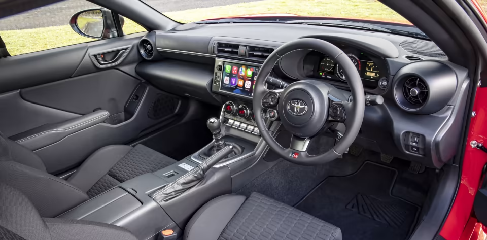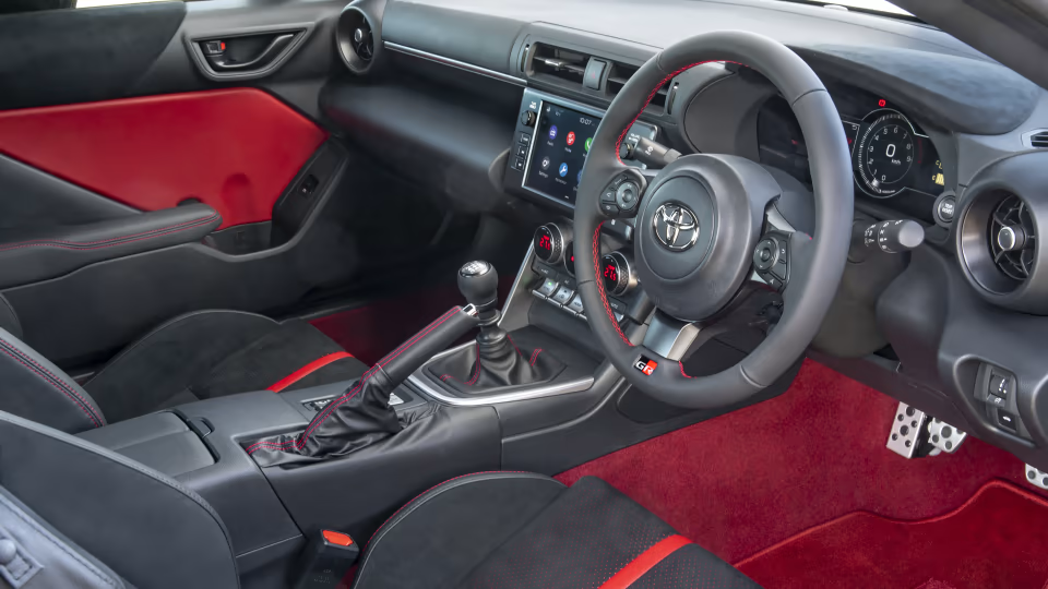 来看具体配置,售价为20.35万元的GR86 GT版本配备17英寸银色轮圈、限滑差速器、LED大灯、织物运动座椅、四向调节皮质方向盘、8英寸中控屏、Apple CarPlay和Android Auto、6扬声器音响、双区自动空调、无钥匙进入和启动、7安全气囊、坡起辅助、定速巡航、自适应巡航系统(仅自动挡)、车道偏离警报(仅自动挡)等。售价为21.36万元的GR86 GTS版本在GT版的基础上增加了18英寸哑光黑轮圈、皮质座椅、前排座椅加热、铝制踏板、遮阳板灯、自适应大灯盲区监控等。