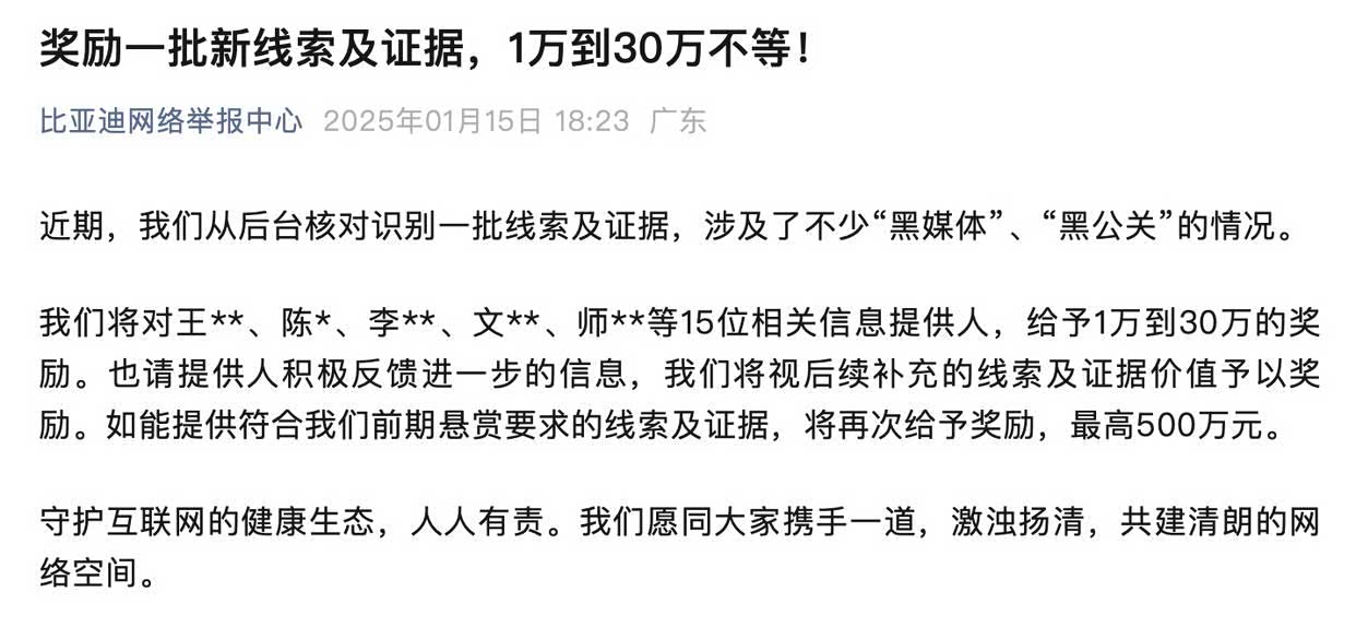 车家号·0浏览·2026-04-02 00:16 · 江苏1 月 15 日,比亚迪网络举报中心发布重要举措,对 15 位提供黑媒体、公关相关线索及证据的信息提供人给予 1 万到 30 万不等的奖励,彰显其坚决打击黑公关的决心。自 2021 年 12 月 28 日启动清朗行动以来,比亚迪持续推进相关工作,并于 2023 年 12 月将奖励金额上限提升至 500 万,且宣布该决定长期有效,不断激励各界协助净化网络环境。