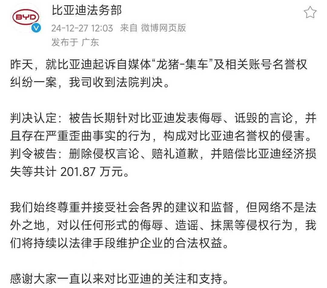 在 2024 年末,比亚迪在法律维权上取得重要成果。起诉自媒体博主 “龙猪 - 集车” 的名誉权纠纷一案胜诉,法院判定被告长期存在侮辱、诋毁比亚迪且严重歪曲事实的行为,构成名誉侵权。最终判令被告删除侵权言论、公开赔礼道歉,并赔偿比亚迪经济损失等共计 201.87 万元。