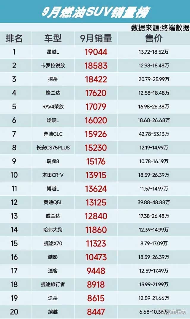 燃油车别乱买,9月燃油SUV销量榜,星越L第1、探岳第3、瑞虎8第9