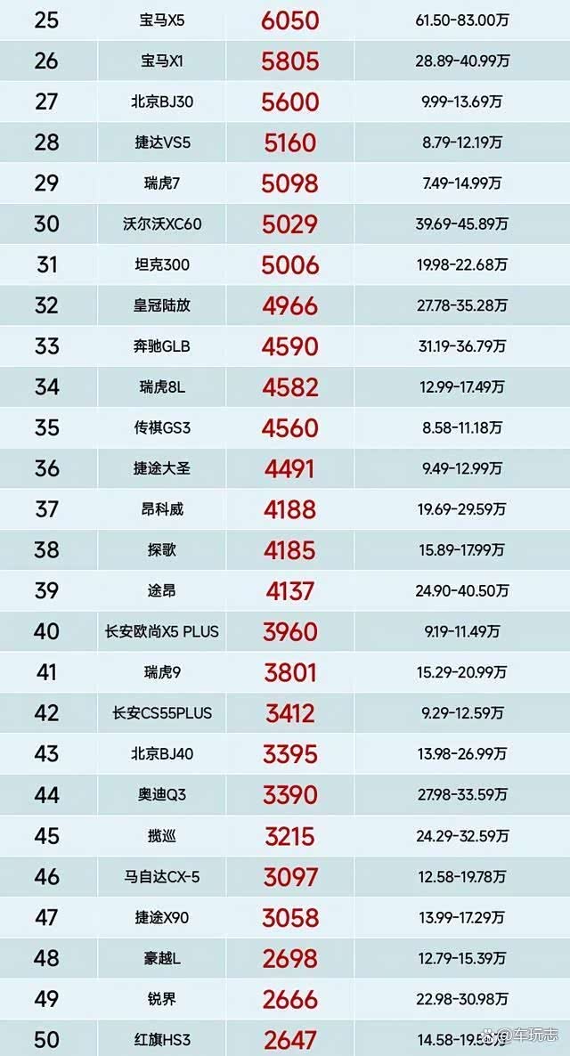 而之后的哈弗H6销量8217辆,排在第22。宝马X3、宝马X5、宝马X1、销量在6559-5805之间。北京BJ30、沃尔沃XC60、瑞虎7、皇冠陆放、传祺GS3、表现一般销量跌于5006辆之下。而奥迪Q3、捷途X90、瑞虎9、红旗HS3销量更是均低于4000辆之下。而靠后的锐界销量2666辆,排在第49。红旗HS3销量2647辆,排在第50名。