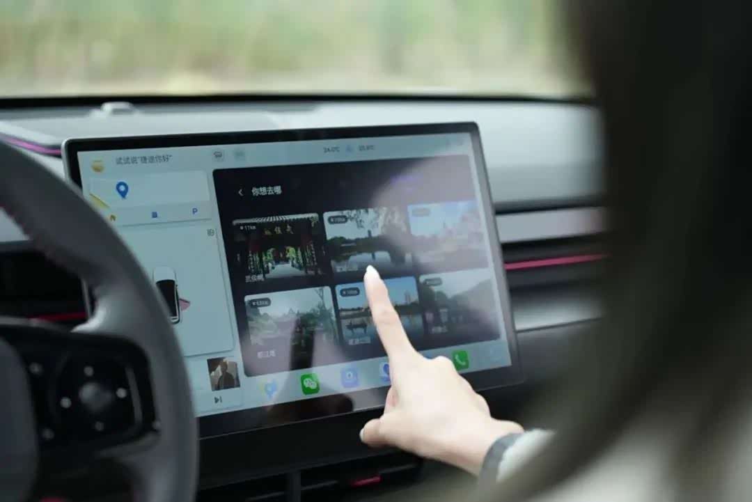捷途大圣拥有特斯拉风格的极简内饰,坐进车内,让人心情放松。只需要呼叫“捷途,你好”,唤醒车机,就可直接使用语音开启天窗、导航、打开空调等。
