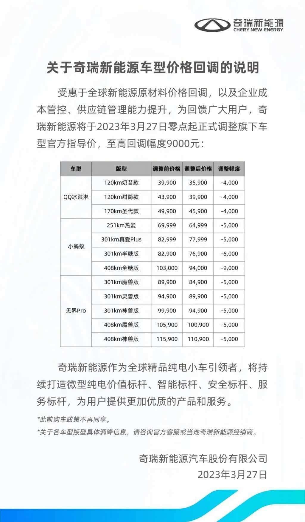 随着车市“价格战”愈演愈烈,奇瑞新能源这个低端新能源品牌也被迫“卷”入其中。近日,奇瑞新能源官宣对 QQ冰淇淋(参数|询价)、小蚂蚁、无界Pro三款车型进行降价,最高降幅达9000元。