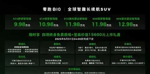 零跑B10新上市,为大客户带来限时特权,包括四项终身免费质保服务(涵盖电池、电驱、电控及整车),同时提供0首付或24期免息金融方案。更赠送价值3680元的家用充电桩及800元交付礼包等多重福利,总计优惠超过1.5万元。详情请咨询当地经销商。经过权益叠加,入门版价格降至9.98万起,激光雷达高级车型也仅需12.98万,比预售时更降低一万元。
