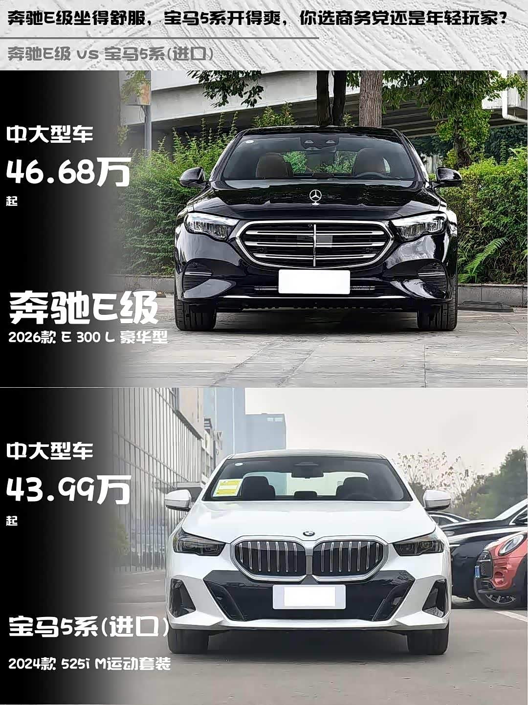 车家号·0浏览·2026-04-02 08:49 · 北京奔驰E级2026款E 300 L豪华型 vs 宝马5系(进口)(参数|询价)2024款525i M运动套装,谁才是中大型豪华轿车的终极选择?🤔