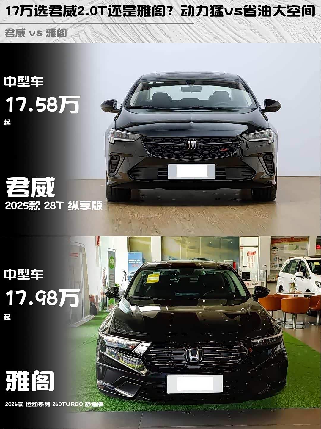 车家号·0浏览·2026-04-02 09:06 · 北京最近在选B级车的小伙伴看过来!今天给大家深度对比两款热门车型—— 君威(参数|询价)2025款28T纵享版和雅阁2025款运动系列260TURBO舒适版,都是17万左右的价位,到底谁更香?🤔