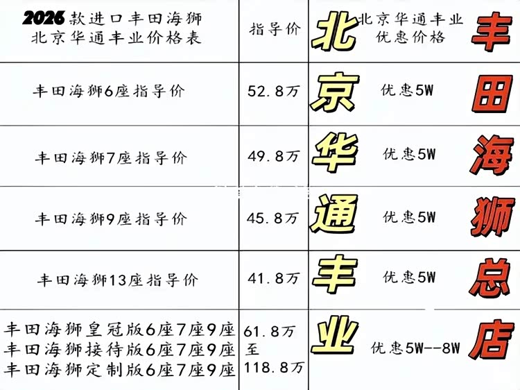 丰田4s专卖店2026款丰田海狮4s店商务车作为原装进口的高端MPV,现已正式登陆官网。其售价区间广泛,根据座位数的不同,价格从37.88万至88.88万不等。具体而言,6座版售价在42-88万之间,7座版42-85万,8座版42-92万,9座版42-80万,10座版42-78万,以及13座版38-75万。2026款丰田海狮超VIP接待版座椅通常支持360度旋转,可与第三排形成面对面的“对坐模式”。在这种模式下,商务人士可以进行深入的商务洽谈,面对面的交流让沟通更加顺畅高效;家庭成员也可以围坐在一起,享受温馨的互动时光,让车厢瞬间变身为私密的移动会客厅。